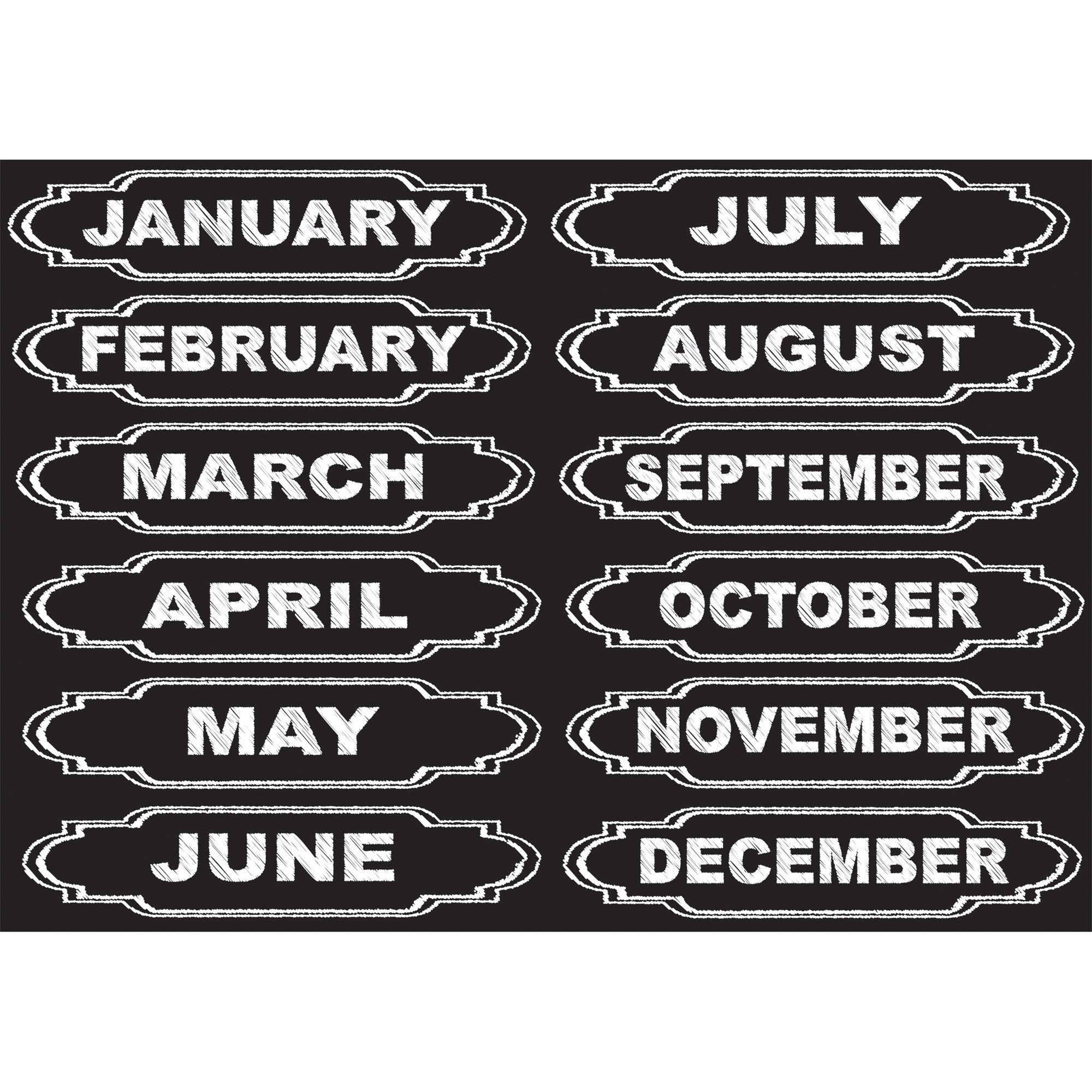 Large Die-Cut Magnetic Chalkboard Calendar Months are great timesavers. Use as headers on your magnetic whiteboards, lockers, refrigerators and other steel surfaces. Write names, goals, assignments, lists and more underneath each month. Bold, white lettering in all caps cannot be ignored. Chalkboard style matches well with coordinating decor. Die-cut pieces easily punch out from the 8-1/2" x 11" sheet. Use write-on/wipe-off surface with dry-erase markers or chalk pen.
