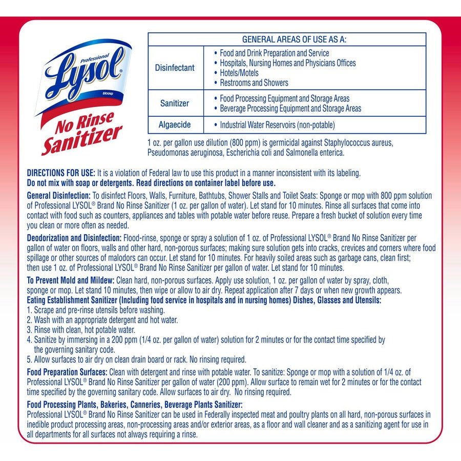 Professional Lysol No Rinse Sanitizer - For Sink, Floor, Wall, Bathtub, Food Service Area - Concentrate - 128 fl oz (4 quart) - Recommended For: Bacteria Remover, Fungi Remover, Virus Remover - Disinfectant, Anti-bacterial - 4 / Carton