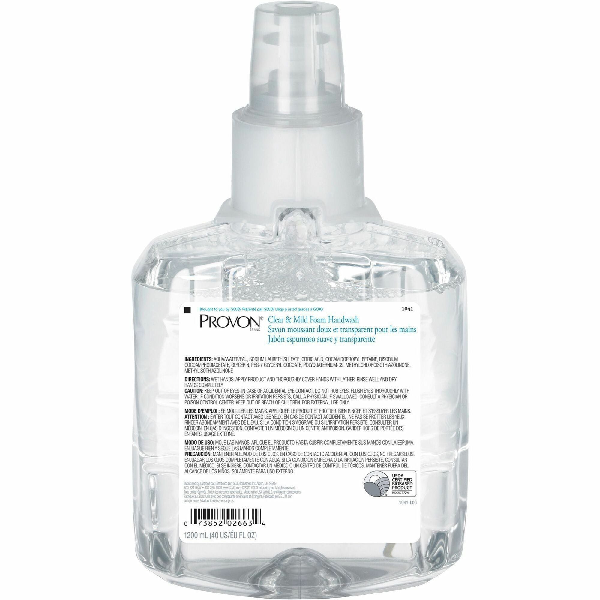 Spa-inspired, green certified, foam hand soap offers luxurious foam lather in a fragrance-free and dye-free formulation that is enriched with moisturizers and skin conditioners. USDA certified, bio-based formulation is EcoLogo certified so it delights users while supporting a healthy environment. Handwash is designed for healthcare settings. Crystal clarity of this PROVON LTX-12 refill offers visual appeal and allows easier monitoring of fill level. Sanitary Sealed refill helps lock out germs. Patent-pending, Controlled Collapse technology keeps bottle shape longer while emptying. A fresh dispensing valve comes with each refill. Removable pump promotes easier recycling.
