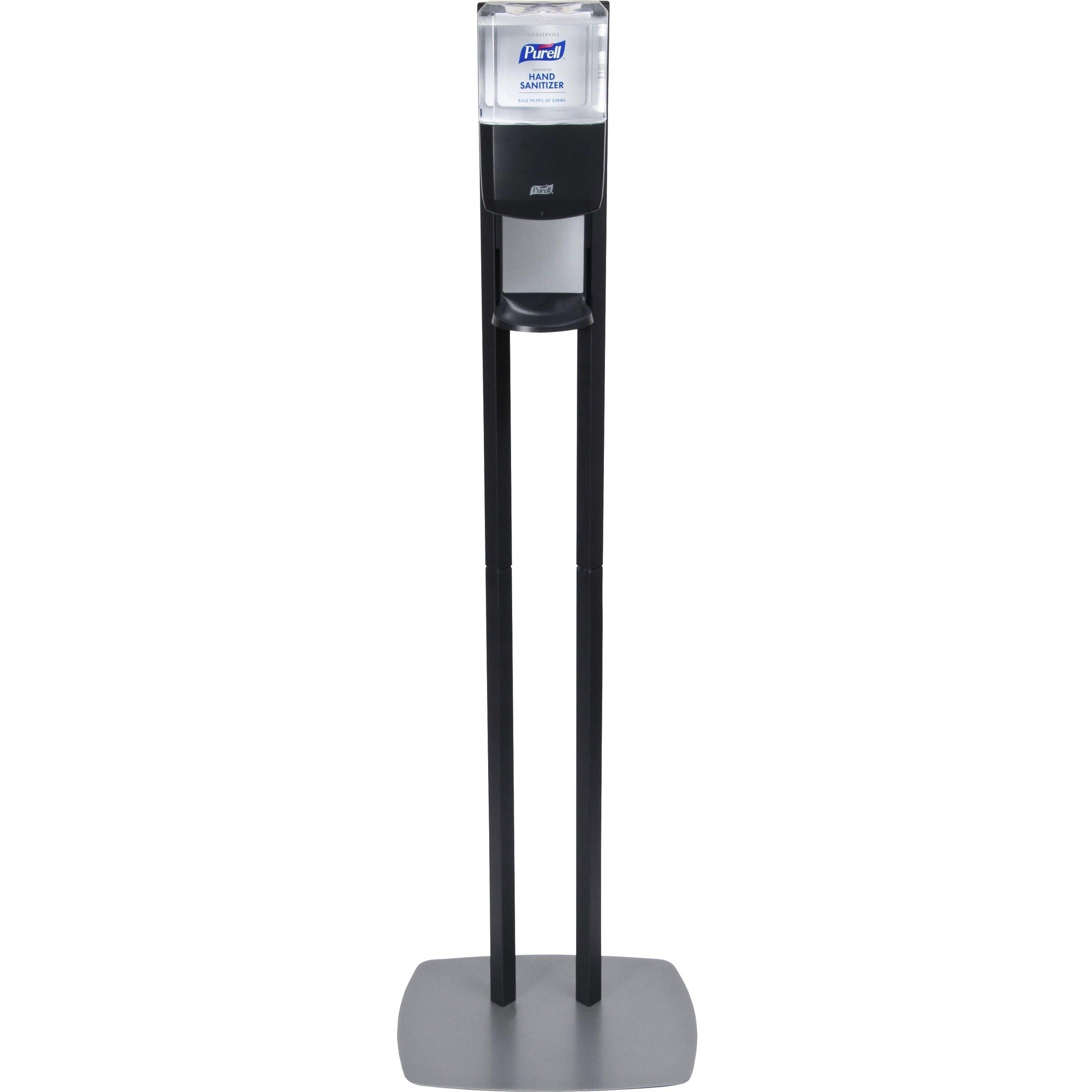 Put PURELL instant hand sanitizer anywhere it's needed. This freestanding unit is a sturdy, movable stand for use in high-traffic locations. It is ideal for lobbies, cafeterias, halls, reception areas, restaurants and other high-traffic areas. Highly visible signage sends the message that you care about reducing the spread of germs. Low-profile baseplate is designed to maximize stability. Silver baseplate hides dirt to maintain a neat appearance. Built-in shield that goes beneath the dispenser keeps surrounding areas clean. Station includes a PURELL ES6 Hand Sanitizer Dispenser with a 1200 ml. capacity. Hand sanitizer dispenser offers hands-free operation for more sanitary use and uses PURELL ES6 1200 ml. Hand Sanitizer refills. The Lock or Not technology can convert the sanitizer dispenser to a locking system. Fully ADA-compliant dispenser is made of durable ABS plastic.