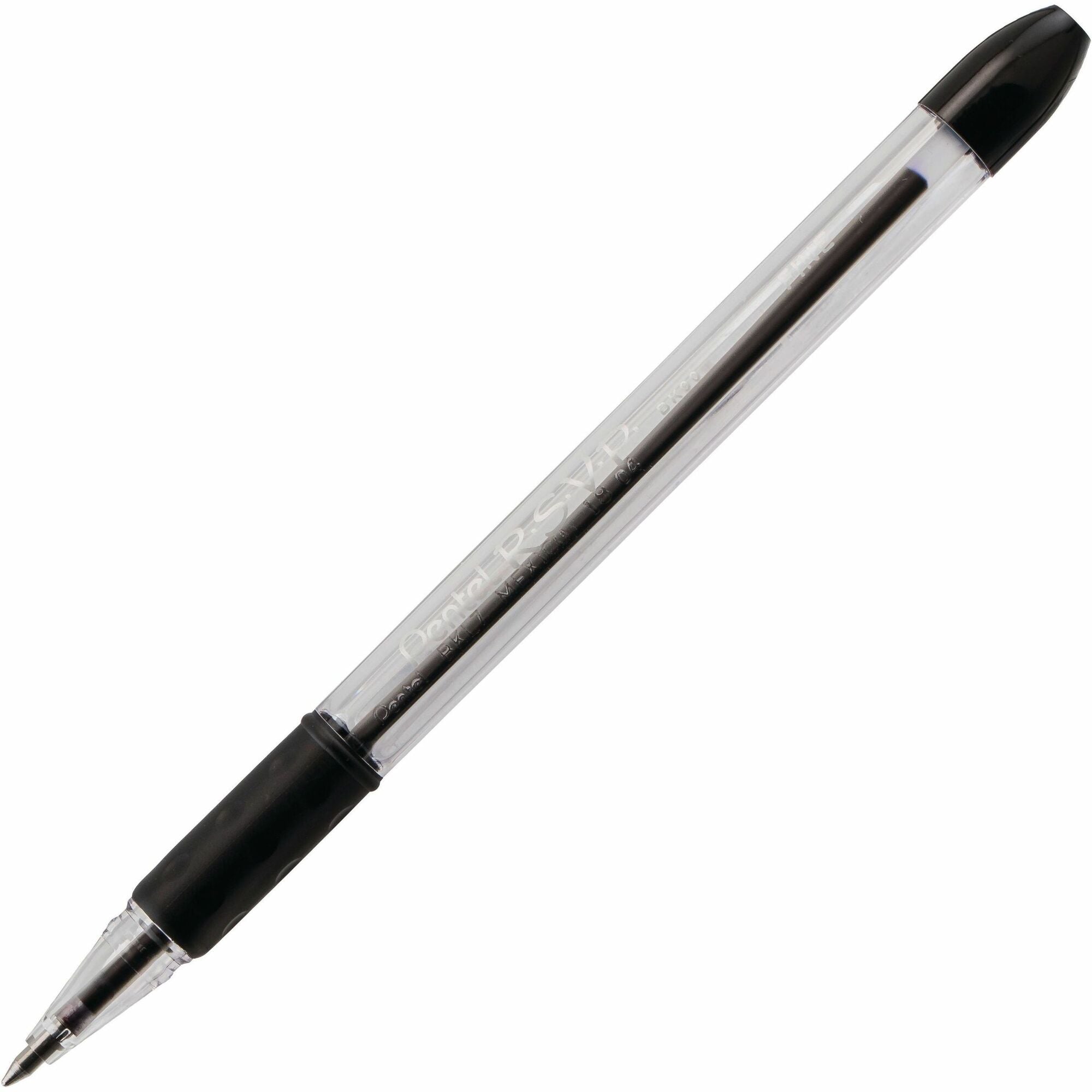 The Pentel R.S.V.P. ballpoint pen is a sturdy, well-balanced pen. A smooth writing pen that writes for over a kilometer without skipping No matter what size hand you have, the long barrel makes this pen exceptionally easy to use Durable tip delivers a consistent line without skipping See how much ink you have through the transparent barrel Escape writing fatigue with our rubber Comfort Zone™ grip 0.7mm point size Non smudging oil-based ink Refillable with any size/color R.S.V.P. ink refill Colour indicator ball on cap and grip colour matches ink colour