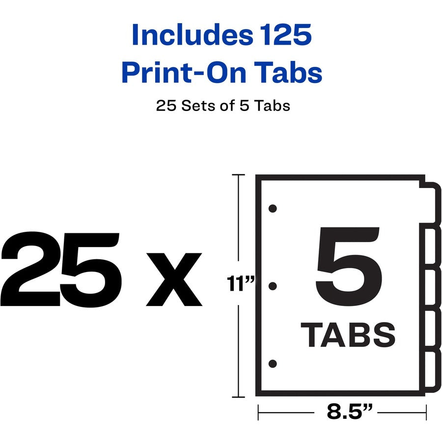 Avery® Customizable Print-On Dividers - 125 x Divider(s) - Print-on Tab(s) - 5 - 5 Tab(s)/Set - 8.5" Divider Width x 11" Divider Length - 3 Hole Punched - White Paper Divider - White Paper Tab(s) - 20% Recycled - 25 / Box