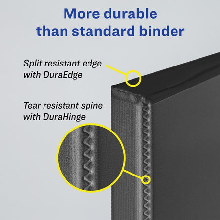 The DuraHinge design of this binder is engineered to be stronger and more durable, making it resistant to tearing and ensuring a longer lifespan. Additionally, the DuraEdge feature enhances the flexibility of the sides and top, preventing splitting and maintaining the binder's integrity over time.