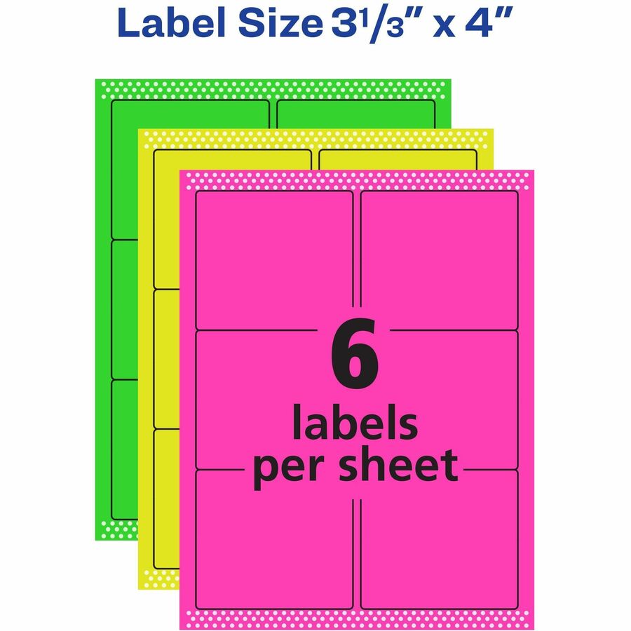 Avery® ID Labels - 3 21/64" Width x 4" Length - Removable Adhesive - Rectangle - Inkjet, Laser - Neon Green, Neon Magenta, Neon Yellow - Paper - 6 / Sheet - 12 Total Sheets - 120 Total Label(s) - 72 / Pack
