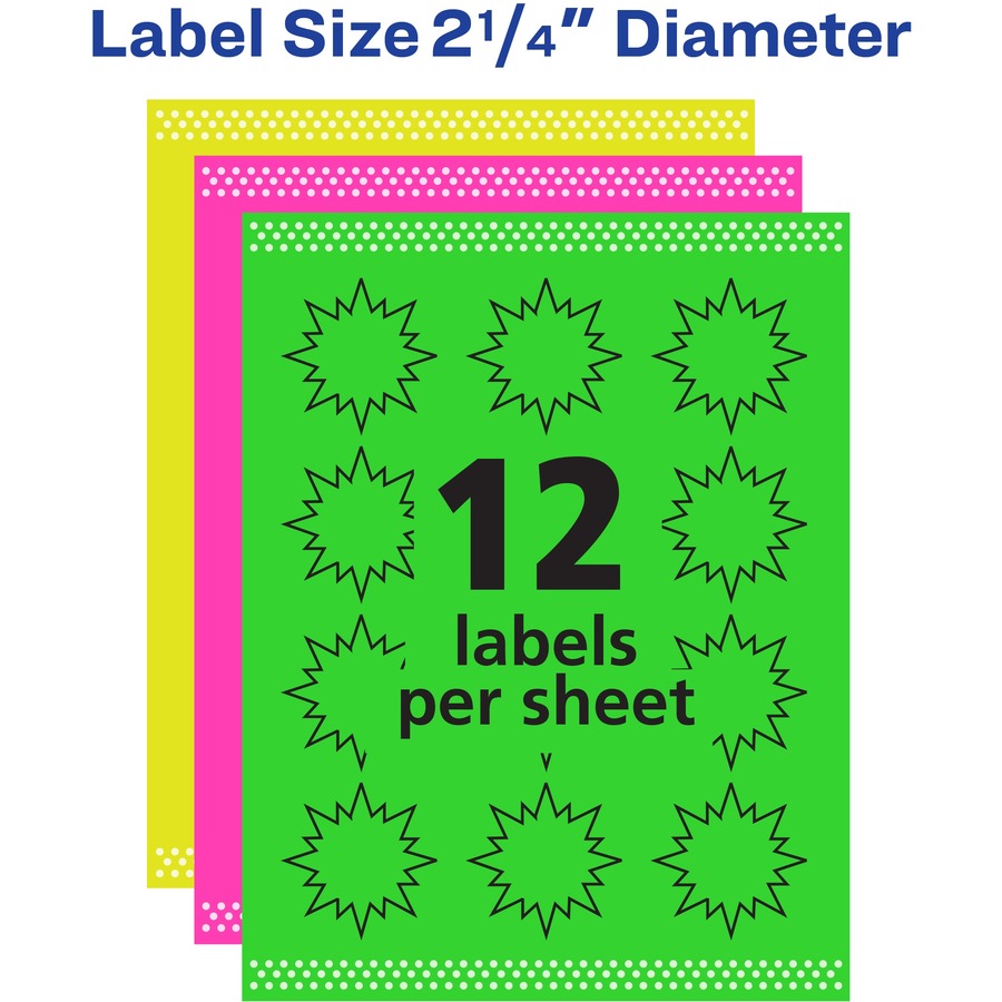 Avery® Neon Burst Labels - 2 1/4" Diameter - Permanent Adhesive - Burst - Laser - Neon Magenta, Neon Green, Neon Yellow - Paper - 12 / Sheet - 15 Total Sheets - 180 Total Label(s) - 180 / Pack