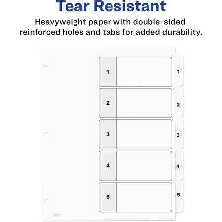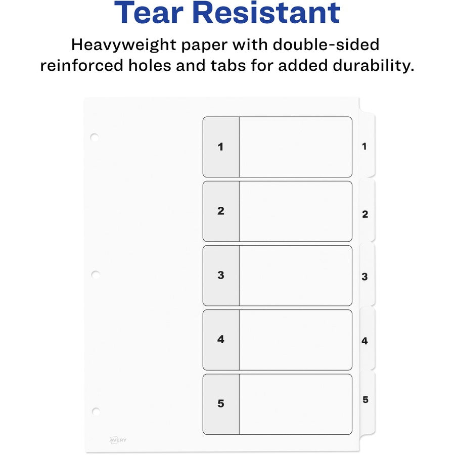 Avery® Ready Index® Table of Contents Dividersfor Laser and Inkjet Printers - 5 x Divider(s) - 1-5 - 5 Tab(s)/Set - 8.5" Divider Width x 11" Divider Length - 3 Hole Punched - White Paper Divider - White Paper Tab(s) - 20% Recycled - 5 / Set