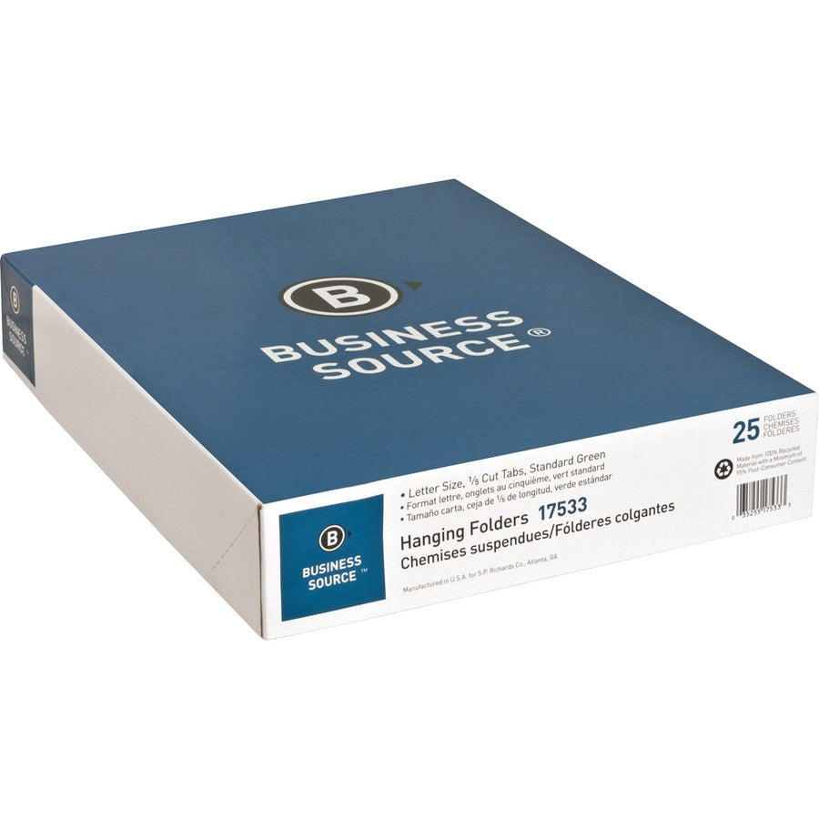Business Source 1/5 Tab Cut Letter Recycled Hanging Folder - 8 1/2" x 11" - 11 pt. - Green - Acid-free - 100% Recycled - 25 / Box