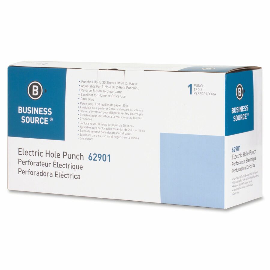 Business Source Electric Adjustable 3-hole Punch - 3 Punch Head(s) - 30 Sheet of 20lb Paper - 1/4" Punch Size - 17.8" Width x 5.3" Depth x 8.3" Height - Gray