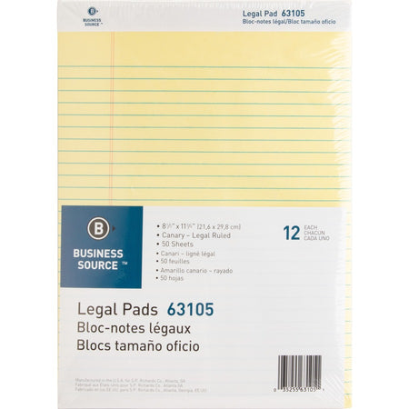 Business Source Micro-Perforated Legal Ruled Pads - 50 Sheets - 0.34" Ruled - 16 lb Basis Weight - 8 1/2" x 11 3/4" Sheet Size - Canary Paper - Micro Perforated, Easy Tear, Sturdy Back - 1 Dozen