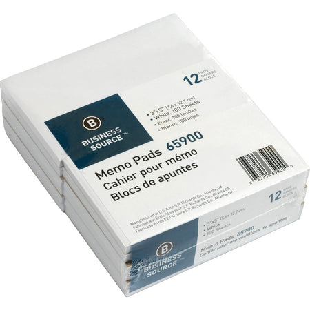 Business Source Plain Memo Pads - 100 Sheets - Plain - Glued - Unruled Front Ruling - 15 lb Basis Weight - 3" x 5" Sheet Size - White Paper - Chipboard Backing - 1 Dozen/Pack - 36 / Carton
