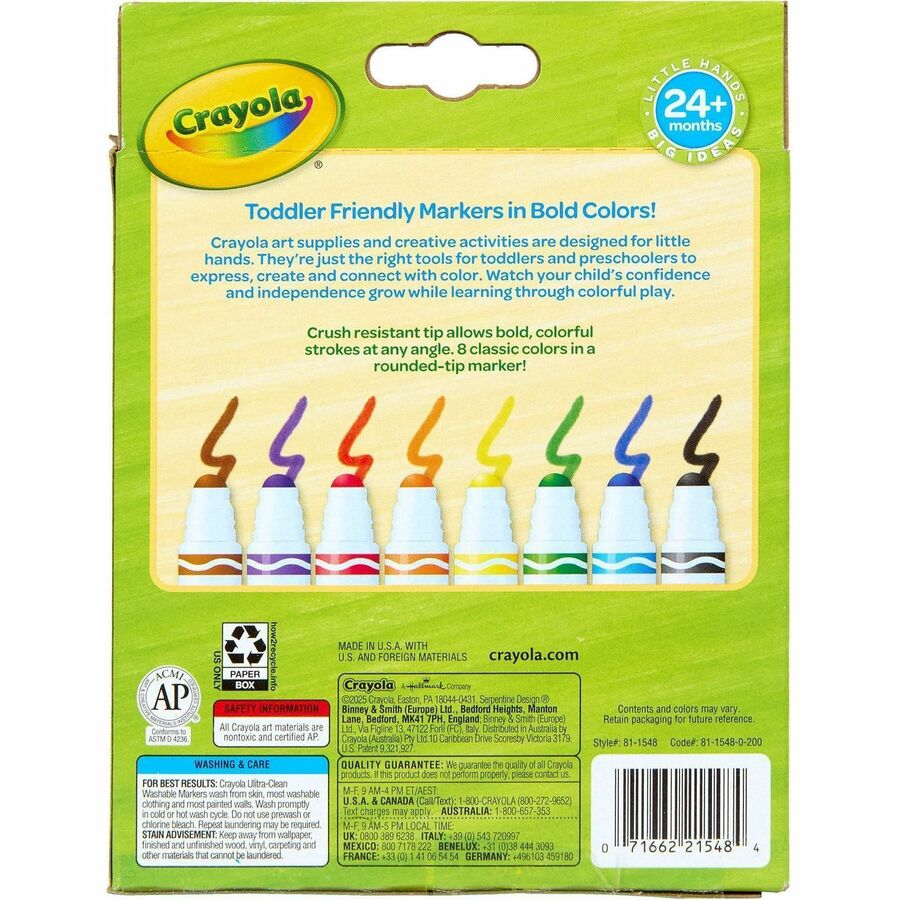 Crayola Crush Resistant Washable Toddler Markers - Bold Marker Point - Washable - Multi Ink - 8 / Pack