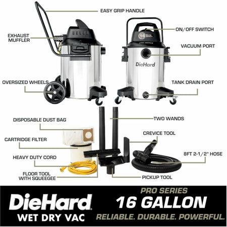 DieHard 16-Gallon 6.5 HP Pro Series Wet/Dry Vacuum - 16 gal - Squeegee, Hose, Wand, Filter, Crevice Tool, Pick-up Tool, Floor Tool - Wet Surface, Dry Surface - 35 ft Cable Length - 8 ft Hose Length - Stainless Steel