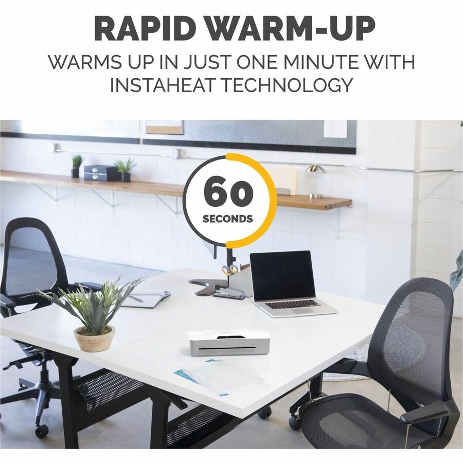 Enhance your document protection with the Personal Laminator featuring innovative InstaHeat technology for a swift one-minute warm-up, ensuring prompt task initiation. The user-friendly release lever allows effortless pouch re-centering or removal, streamlining your laminating process.
