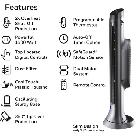 Honeywell Motion Sensor Ceramic Heater - Ceramic - 1500 W - 2 x Heat Settings - Timer - 1500 W - Oscillation - Indoor - Tower - Dark Gray