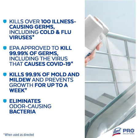Get maximum versatility with minimal effort using Lysol Disinfectant Spray that's safe to use on hard and soft surfaces. Lysol kills 99.9 percent of viruses and bacteria, including the virus that causes COVID-19 and cold and flu viruses when used as directed. Help protect high-traffic areas and high-touch surfaces, including desks, bathrooms, doorknobs and railings. Deliver hospital-type disinfection onto soft surfaces, including upholstery, curtains, sofas, mattresses and cushions. Meet customer and staff expectations around disinfection. Simply spray and let air-dry.