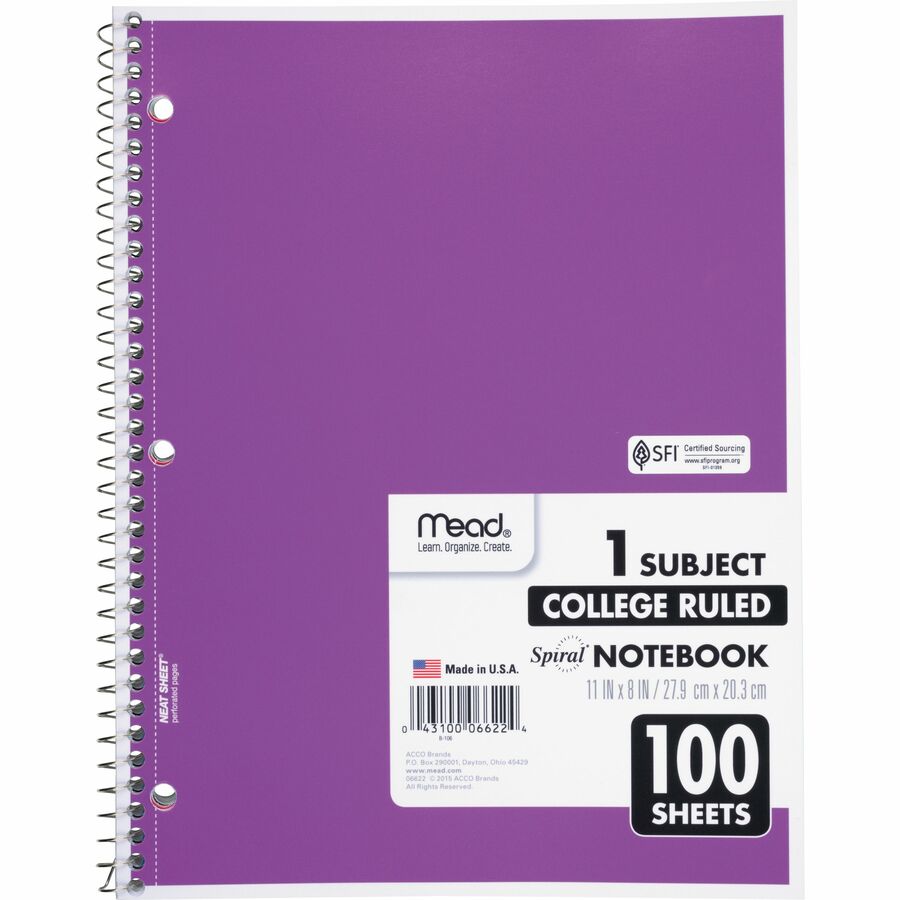 Mead One-subject Spiral Notebook - 100 Sheets - Spiral - College Ruled Front Ruling - 8" x 10 1/2" Sheet Size x 8" Width x 10.5" Length - White Paper - Back Board - 1 Each