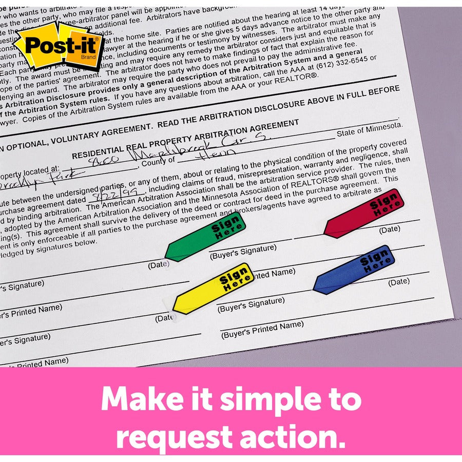 Post-it® Arrow Flags - 1/2" Flag/Note Width - Arrow - Blank and SIGN HERE - Green, Yellow, Blue, Red, Pink - Removable, Self-adhesive, Repositionable - Dispenser Included - 252 / Pack