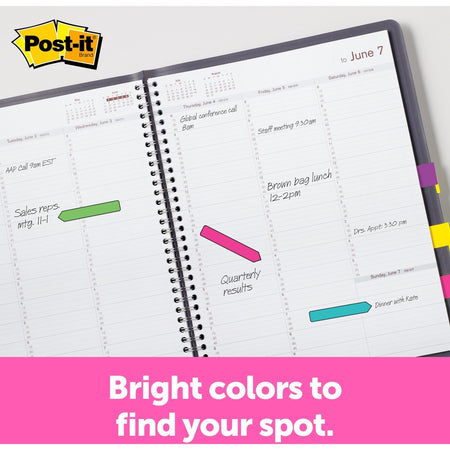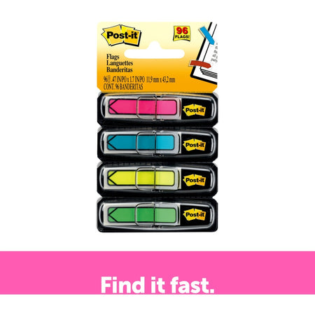 Post-it® Arrow Flags - 24 x Pink, 24 x Blue, 24 x Yellow, 24 x Green - 1/2" Flag/Note Width x 1 3/4" Flag/Note Length - Arrow, Rectangle - Unruled - Pink, Green, Blue, Yellow, Aqua - Removable, Self-adhesive - Dispenser Included - 96 / Pack