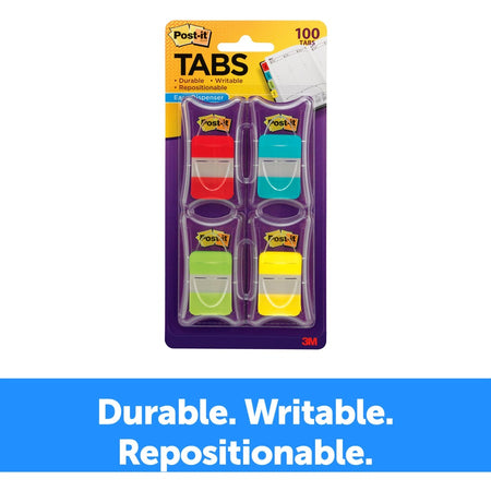 Post-it® Tabs - 100 Write-on Tab(s) - 1" Tab Height x 1.50" Tab Width - Red, Blue, Green, Yellow Tab(s) - Tear Resistant, Wear Resistant, Repositionable, Durable - 100 / Pack