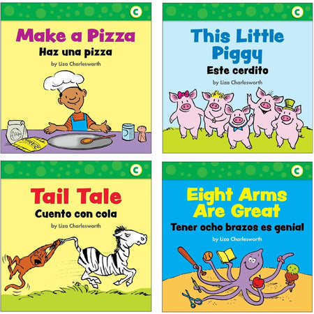 Enhance English Language Learners' reading skills with these engaging bilingual books. Designed to align with Guided Reading Level C, each book presents simple, repetitive stories with high-frequency words and captivating illustrations on popular topics. Ideal for early learners and those exploring a new language, this book set includes 100 titles across 20 different stories, with five copies of each title for classroom use. Each book features eight pages, and the set comes with a 32-page teaching guide and a convenient storage unit. Give your students the support they need to succeed in reading with these educational and entertaining resources.