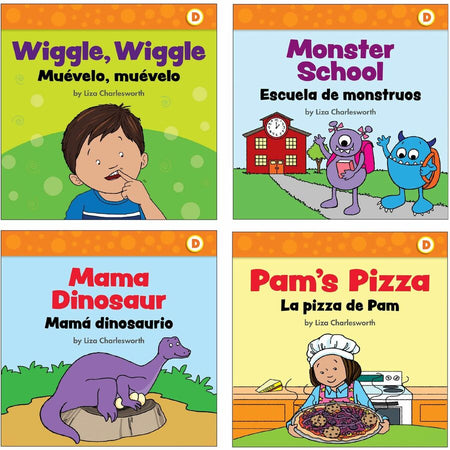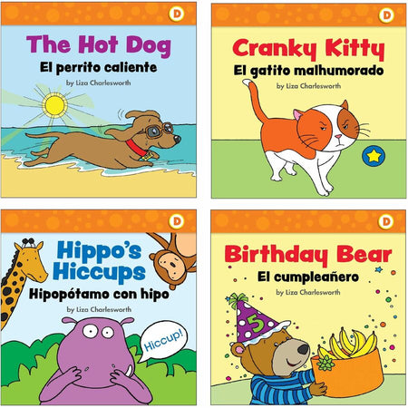 Enhance English Language Learners' reading skills with these engaging bilingual books. Designed to align with Guided Reading Level D, each book presents simple, repetitive stories with high-frequency words and captivating illustrations on popular topics. Ideal for early learners and those exploring a new language, this book set includes 100 books across 20 titles, with five copies of each title for classroom use. Each book features eight pages, and the set comes with a 32-page teaching guide and a convenient storage unit.