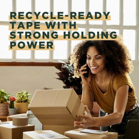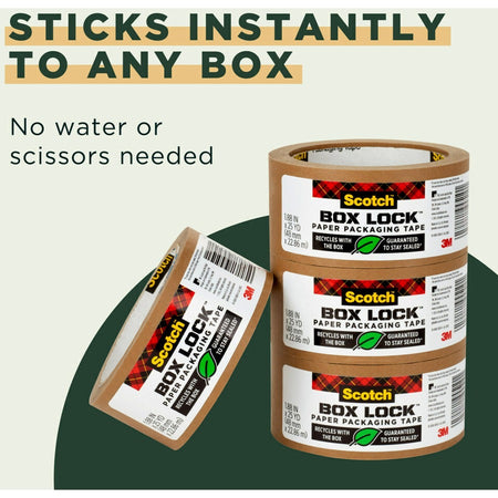 A more sustainable alternative to plastic packaging tape, Scotch Box Lock Paper Packaging Tape is made with 45 percent bio-based material and is curbside recyclable. It is guaranteed to stay sealed, but you can still tear it by hand. Extreme grip ensures boxes stay securely sealed, even during rough handling. Solvent-free adhesive creates a secure seal over box edges better than other leading premium packaging tapes and sticks better on cardboard too. It is designed to be thicker than many competitive tapes, which reduces splitting and tearing and makes it easier to find the start of the roll. This tape can be used on any type of box, including harder-to-stick to 100 percent recycled boxes.