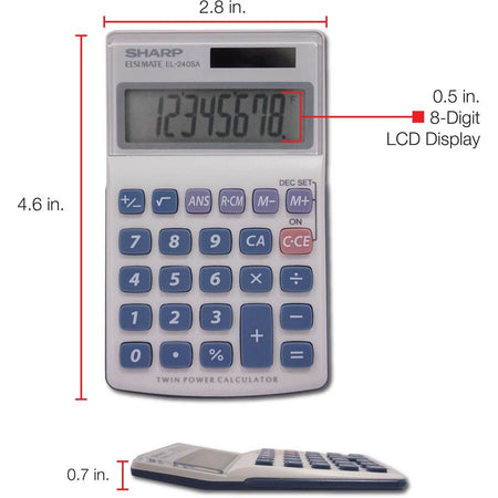Sharp Calculators EL-240SAB 8-Digit Handheld Calculator - 3-Key Memory, Sign Change, Auto Power Off - 8 Digits - LCD - Battery/Solar Powered - 1 x LR1130 - 0.7" Height x 2.8" Width x 4.6" Depth - Gray, Blue - 1 Each