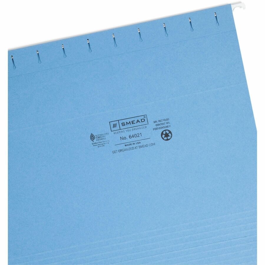 Smead 1/3 Tab Cut Letter Recycled Hanging Folder - 8 1/2" x 11" - Top Tab Location - Assorted Tab Position - 11 pt. - Poly - Blue - 10% Paper Recycled - 25 / Box