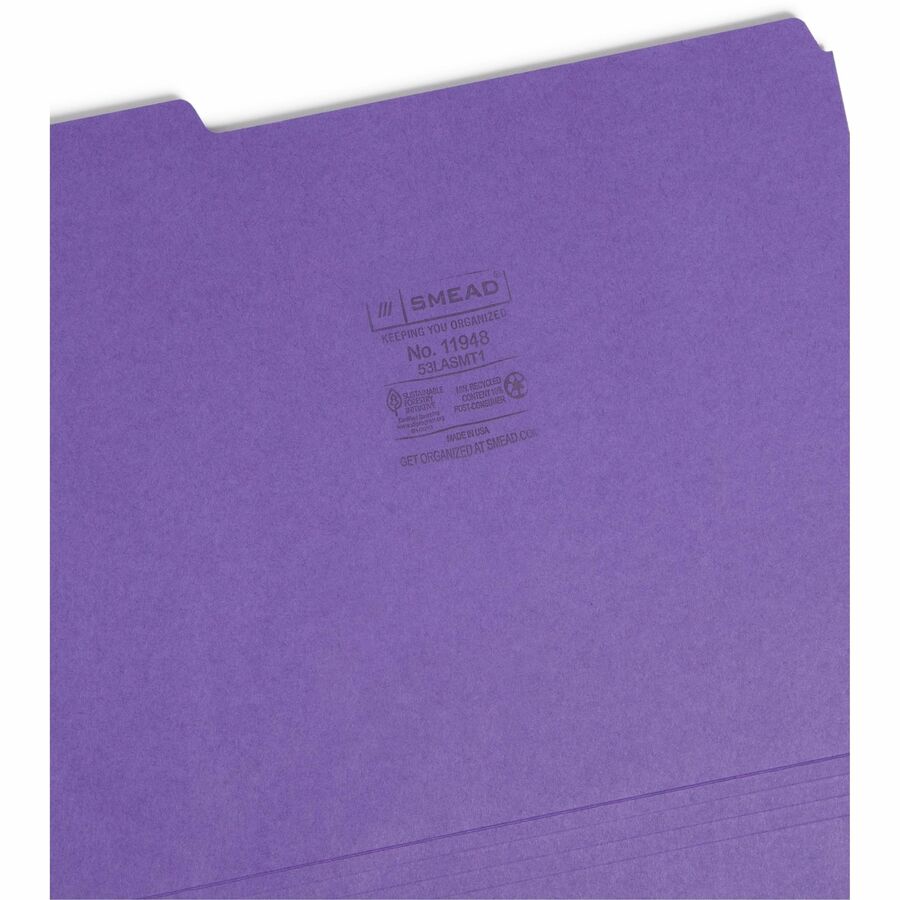 Smead 1/3 Tab Cut Letter Recycled Top Tab File Folder - 8 1/2" x 11" - 3/4" Expansion - Top Tab Location - Assorted Tab Position - 11 pt. - 1 Plys - Assorted - Rounded Corner - 10% Recycled - 100 / Box