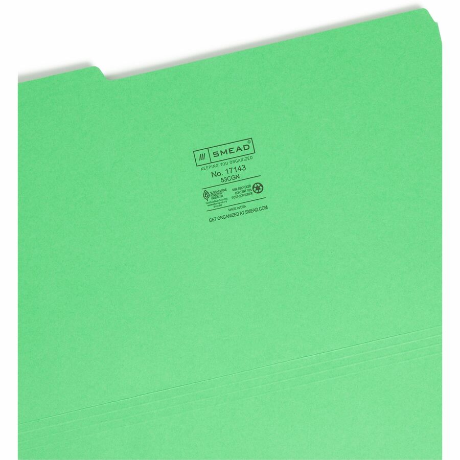 Smead Colored 1/3 Tab Cut Legal Recycled Top Tab File Folder - 8 1/2" x 14" - 3/4" Expansion - Top Tab Location - Assorted Tab Position - 11 pt. - 1 Plys - Green - Break Resistant - 10% Recycled - 100 / Box