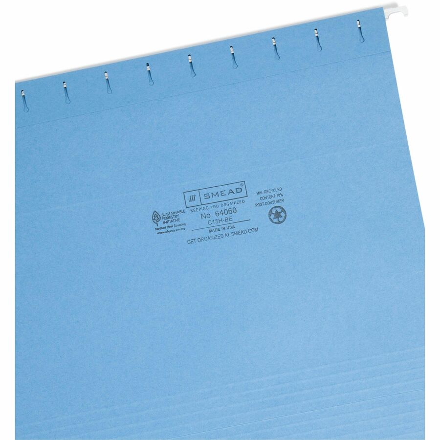 Smead Colored 1/5 Tab Cut Letter Recycled Hanging Folder - 8 1/2" x 11" - Top Tab Location - Assorted Tab Position - 11 pt. - Vinyl - Blue - 10% Recycled - 25 / Box