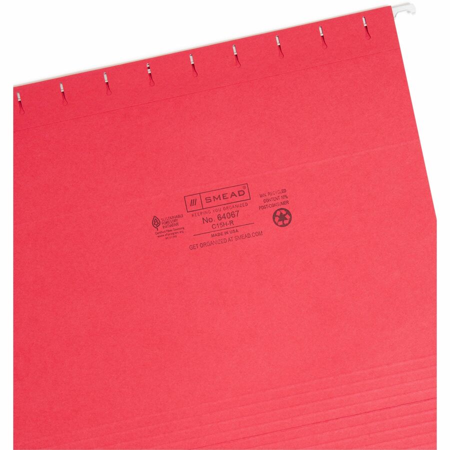Smead Colored 1/5 Tab Cut Letter Recycled Hanging Folder - 8 1/2" x 11" - Top Tab Location - Assorted Tab Position - 11 pt. - Vinyl - Red - 10% Recycled - 25 / Box