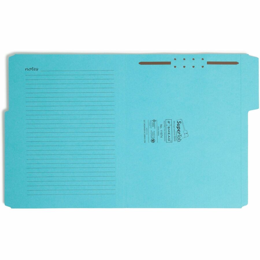 Smead SuperTab 1/3 Tab Cut Letter Recycled Fastener Folder - 8 1/2" x 11" - 1 x 2K Fastener(s) - Top Tab Location - 11 pt. - 2 Plys - Pink, Yellow, Goldenrod, Aqua - Preprinted, Reinforced, Durable, Labeling Area - 10% Recycled - 24 / Pack
