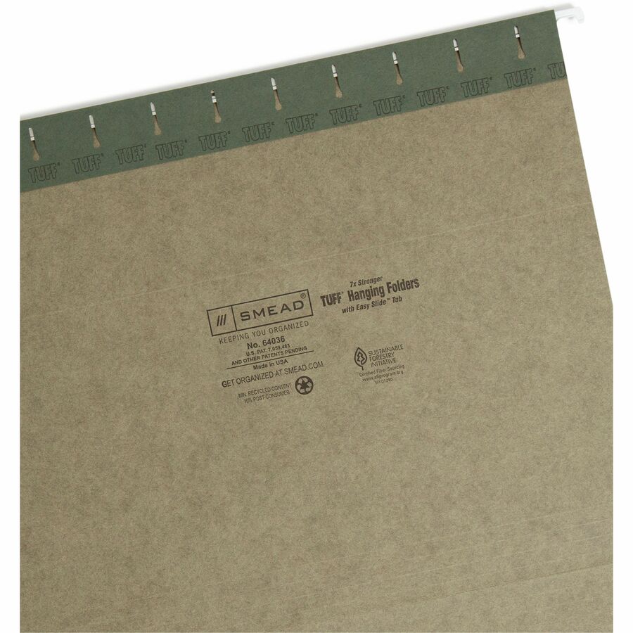 Smead TUFF 1/3 Tab Cut Letter Recycled Hanging Folder - 8 1/2" x 11" - Top Tab Location - Assorted Tab Position - 11 pt. - Standard Green - Heavy Duty, Tear Resistant - 10% Recycled - 20 / Box