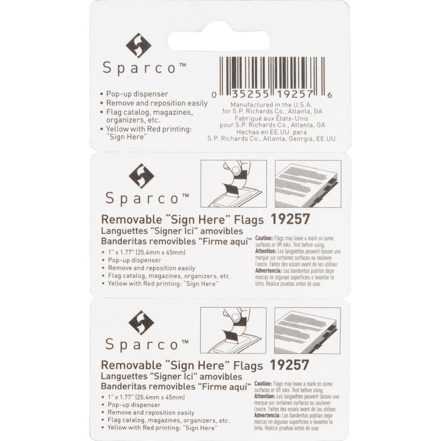 Sparco Pop-up Sign Here Flags in Dispenser - 1" Flag/Note Width x 1 3/4" Flag/Note Length - Rectangle - SIGN HERE - Yellow - Self-adhesive, Removable - Dispenser Included - 100 / Pack
