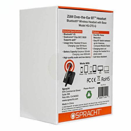 Spracht ZUM Bluetooth Headset: Mono Wireless Over-the-Ear - Matte Black