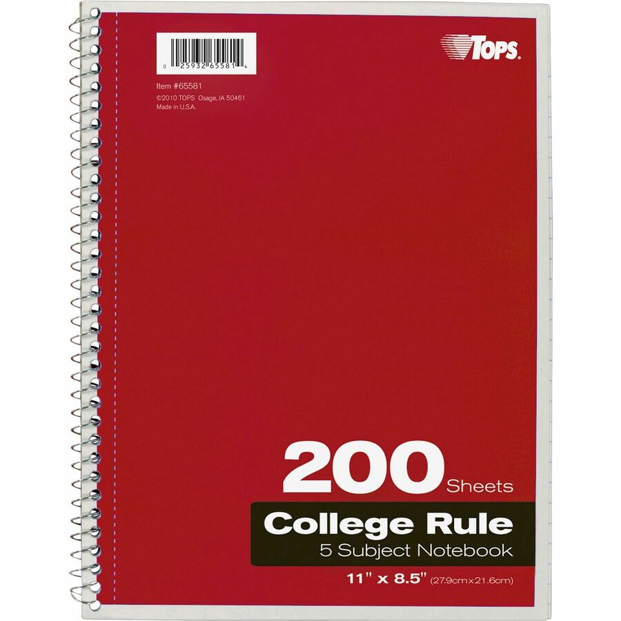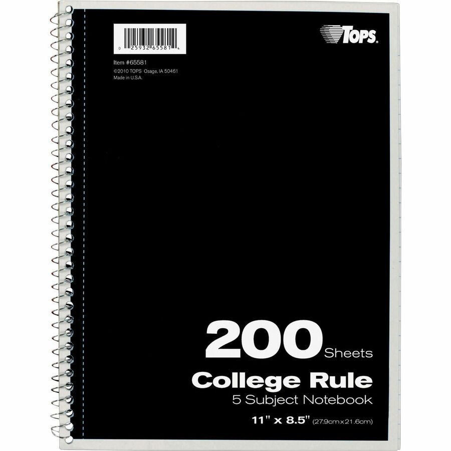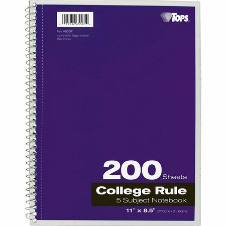 TOPS 5 - subject College - ruled Notebooks - Letter - 200 Sheets - Wire Bound - Letter - 8 1/2" x 11" Sheet Size - 0.25" Height x 8.5" Width x 11" Length - Assorted Paper - Black, Red, Blue, Green, Purple Cover - Divider, Perforated - 1 Each