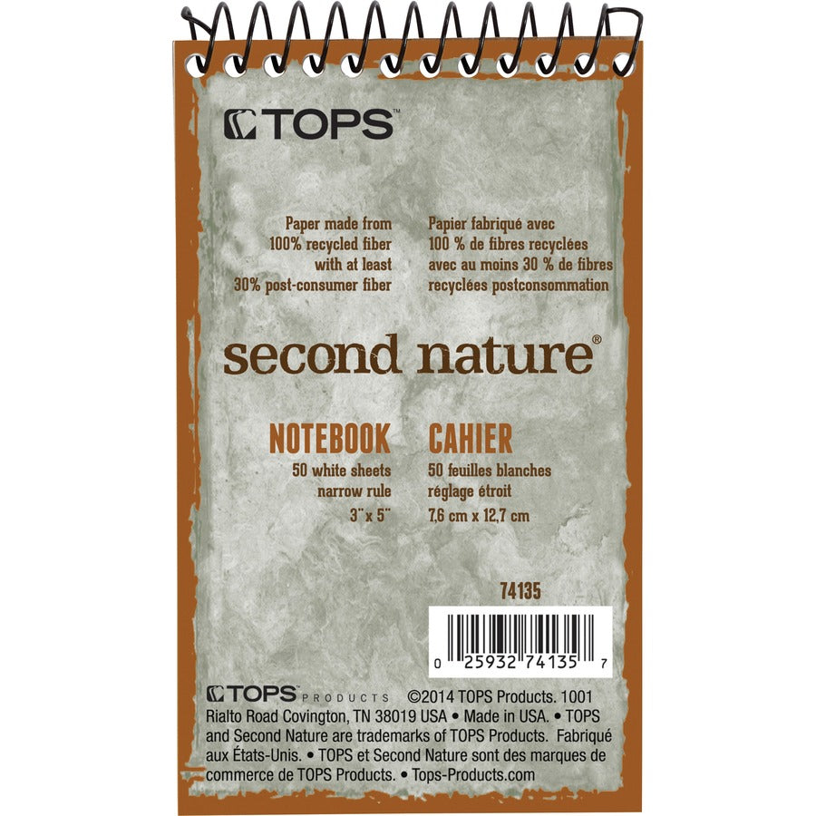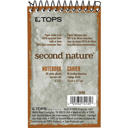 TOPS Second Nature Narrow Ruled Notebooks - 50 Sheets - Spiral - 3" x 5" Sheet Size - White Paper - Recycled - 1 Each
