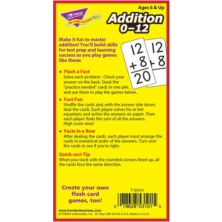Sturdy, self-checking flash cards with rounded corner for quick sort, and no see-through design. Helps to provide basic skill-building for individuals, small groups, or whole classroom. Addition 0-12. 3" x 6". Ages 6 & up. 91/box.