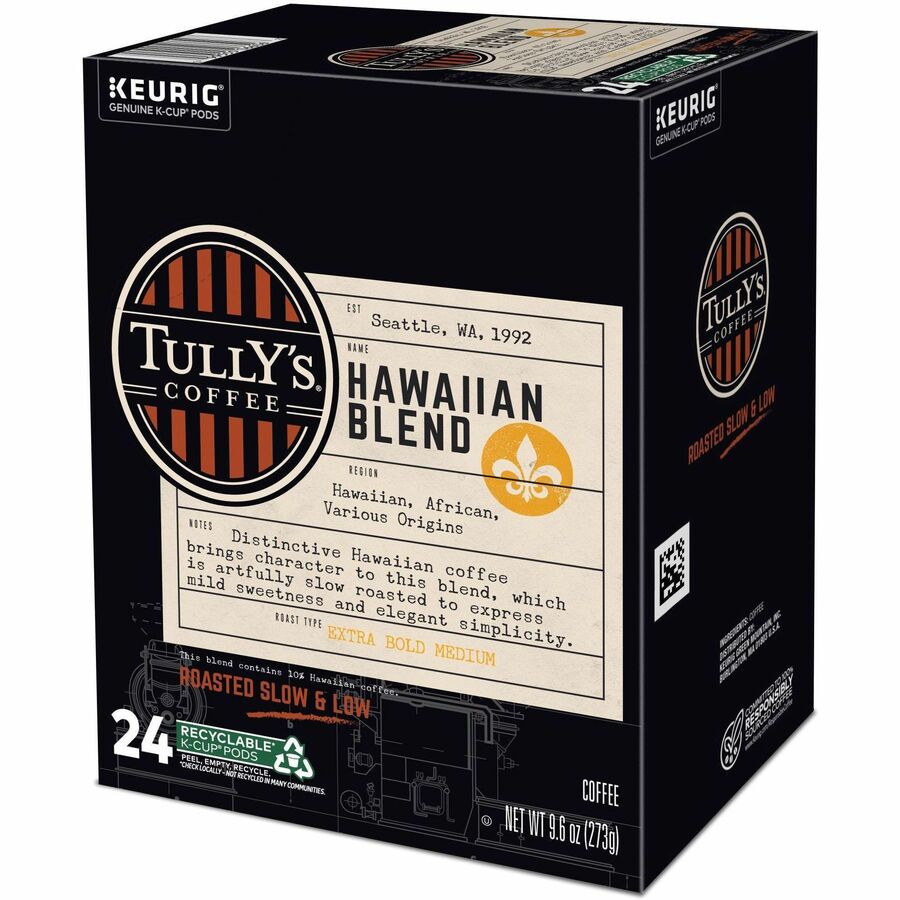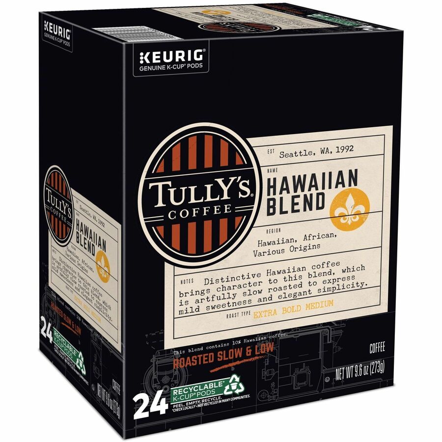 Tully's K-Cup, Pod Hawaiian Blend Keurig Single-Serve K-Cup Pods, Medium Roast Coffee, 24 Count - Compatible with Keurig K-Cup Brewer - Regular - Extra Bold Medium - 9.6 oz - 24 K-Cup - K-Cup, Pod - Hawaiian Blend - Kosher - 24 / Pack