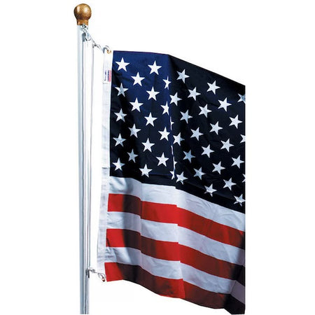 This residential in-ground pole kit comes complete with a 3 ft. by 5 ft. printed polycotton U.S. flag, an 18 ft. 19-gauge 5-section white steel pole, 3 in. gold aluminum ball top, 6 in. cast aluminum cleat, halyard rope, two snap hooks and 18 in. PVC ground sleeve. Flag is 100% made in the U.S.A.