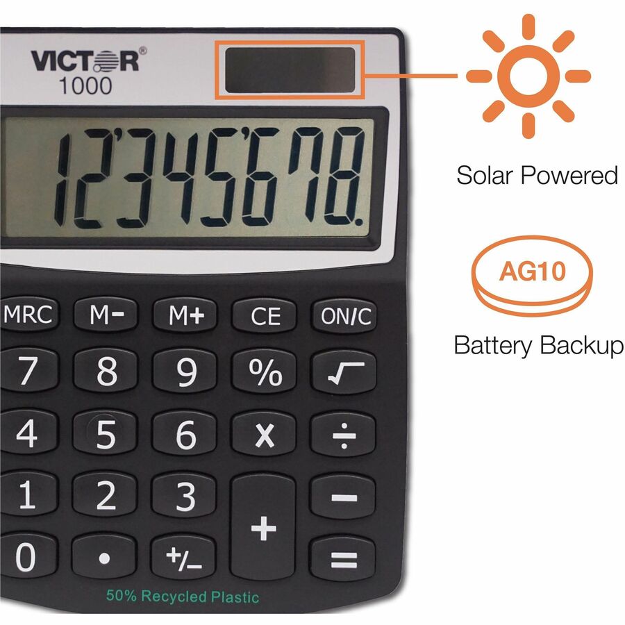 Victor 1000 Mini Desktop Calculator - Large LCD, Battery Backup, Independent Memory, Plastic Key, Dual Power - 0.71" - 8 Digits - LCD - Battery/Solar Powered - 0.5" Height x 3.3" Width x 4.3" Depth - Black - Plastic - 1 Each