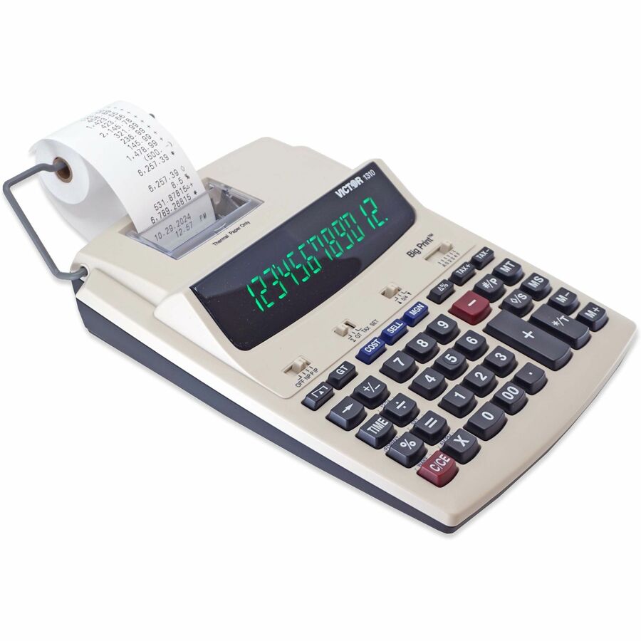 Victor 1310 Printing Calculator - Thermal - Black Print - 9 lps - Date, Clock, Independent Memory - 12 Digits - LED - AC Supply Powered - 7.5" Height x 2.2" Width x 9.5" Length - White - 1 Each