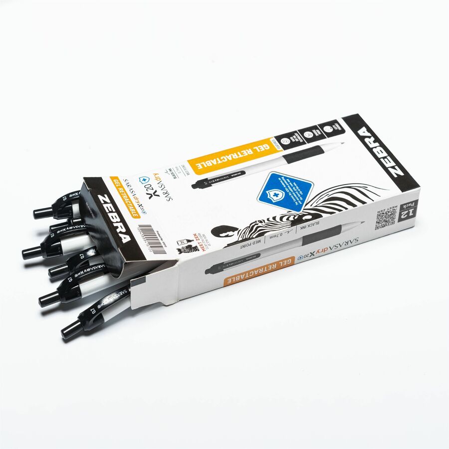 Zebra SARASA dry X20+ Gel Retractable RDI - 0.7 mm Medium Conical Pen Point - Retractable - Black Ink - Gel-based - White Plastic Barrel - Writing, Document, Classroom, Home, Office - 12 / Pack